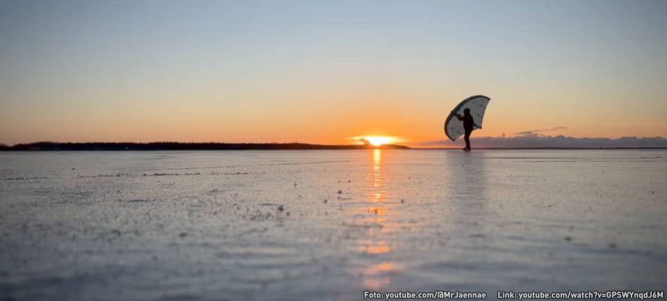 Mit Wing und Ski auf den zugefrorenen Greifswalder Bodden. Das funktioniert erstaunlich gut, wie Fotos und das Video...