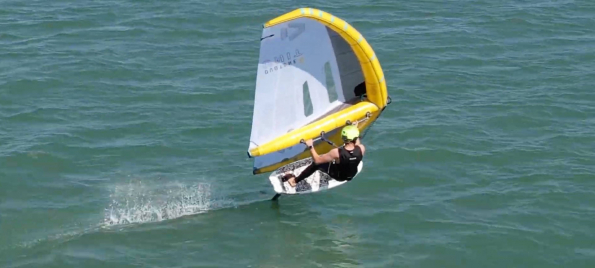 Wingfoilen auf der Heckwelle eines Fährschiffs. Diese Aufnahme hat Stephane Cros zwischen der Golden Gate Bridge und Alcatraz mit einer Action Cam am Wing von sich selbst geschossen.