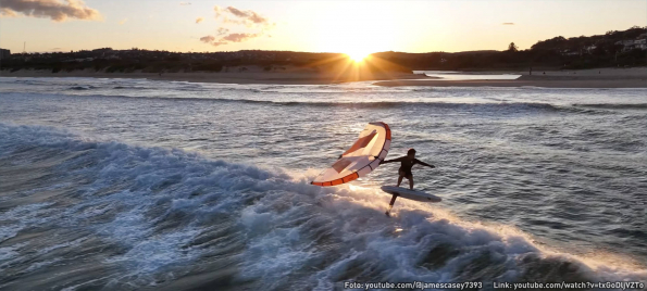 Der australische Wingfoil Coach James Casey in den Wellen des Long Reef Beach der Nähe von Sydeny. Eine Sunset Session...
