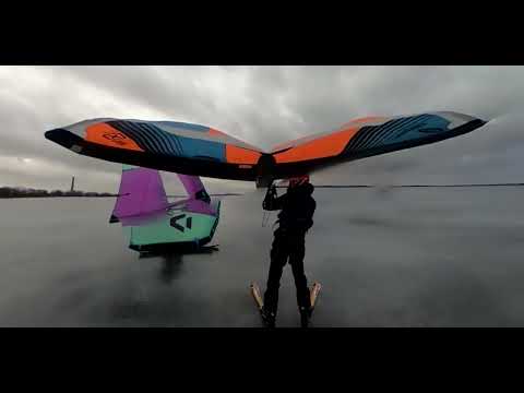 Mit Skiern und Wing aufs Eis. Eine Wing Session in Rekyva/Litauen vom 20. Februar 2022. Die scharfen Kanten der Carving Ski greifen bei der Kurvenfahrt, gefilmt mit 360-Grad-Kamera.