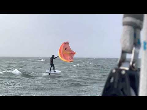 Kurzer Ride neben einem Boot, Wingfoilen in der Bucht von San Francisco nördlich von Treasure Island.