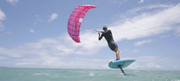 Zum Sliden müsst ihr den Frontwing zur Wasseroberfläche führen. Das funktioniert ähnlich wie bei einem Absprung – allerdings sehr dosiert, so dass der Foil nur gerade eben die Wasseroberfläche durchbricht und dann auf dem Wasser aufsetzt.