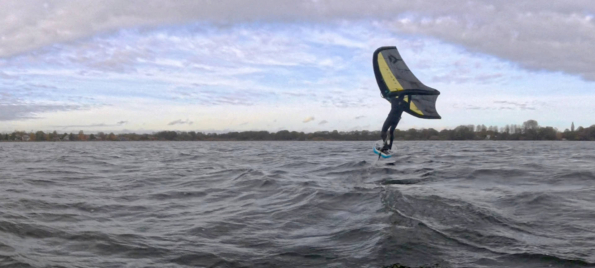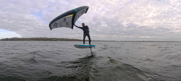 Mit back gehaltenem Wing in die Halse fahren. Hier sehr ihr die Backwind Jibe als Abschluss eines Backwind Ride...