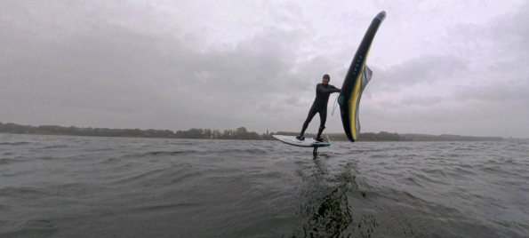 When foiling downwind, the power in the wing decreases so that you can easily push the wing tip through the wind to the other side. Now you’re standing on the board in a normal riding position and can easily complete the jibe.