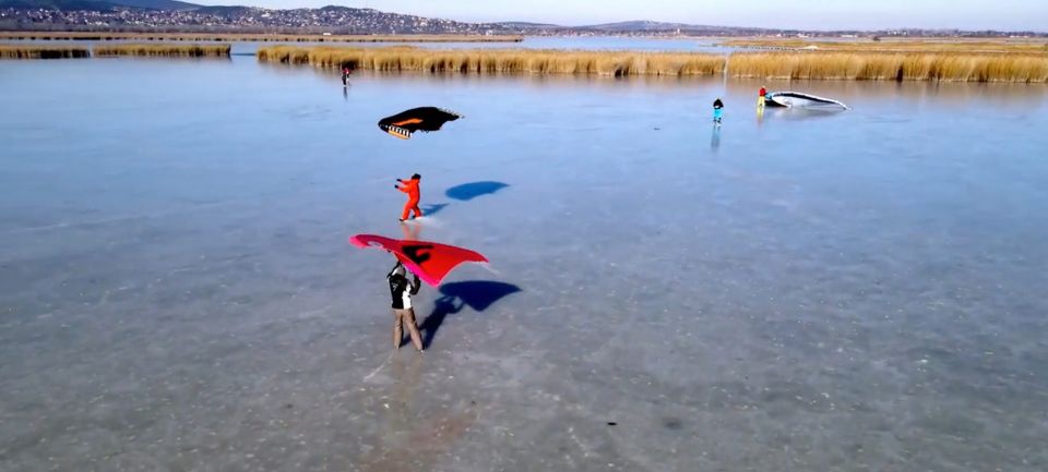 Wind Winging on Ice. Eiszeit in Ungarn. Rauf auf den gefrorenen See mit allem, was die Spur halten kann: Wingen mit...