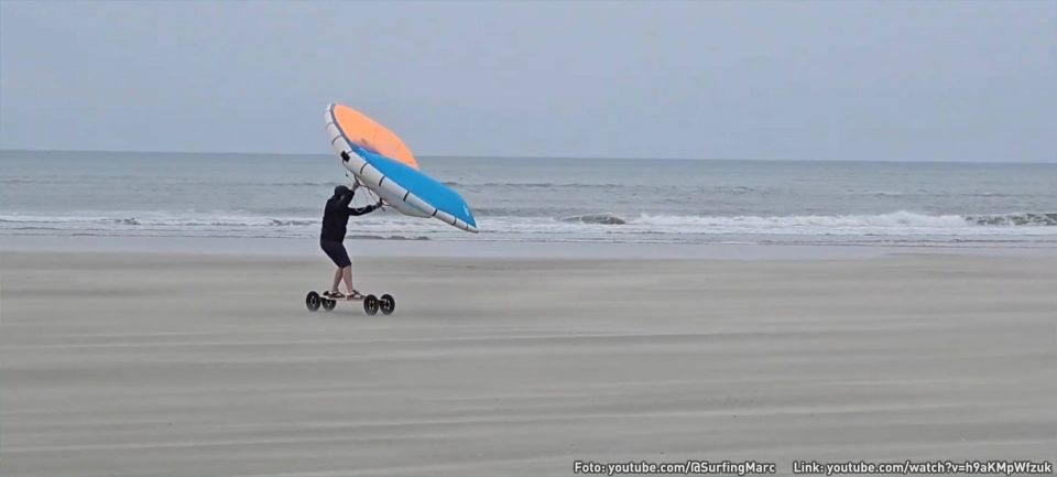 Wing Landboarding. Mit Landboard und Wing an einem dänischen Strand. Die großen luftgefüllten Reifen rollen gut auf...
