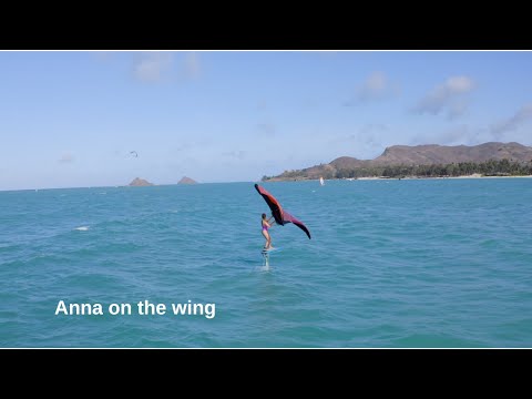 Wingfoilen in der Kailua Bay auf Oahu/Hawaii. Drone Shots über einer traumhaften Bucht. Interessant: Anna Kalabukhova trägt die Wing-Leash am Oberarm.