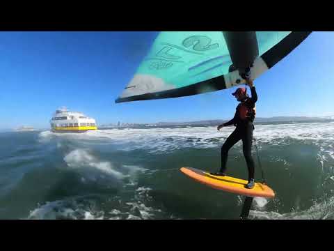 Wingfoilen auf der Heckwelle eines Fährschiffs. Diese Aufnahme hat Stephane Cros zwischen der Golden Gate Bridge und Alcatraz mit einer Action Cam am Wing von sich selbst geschossen.