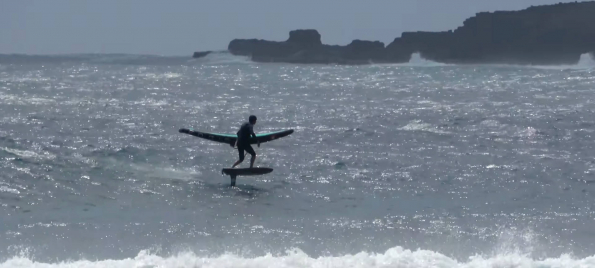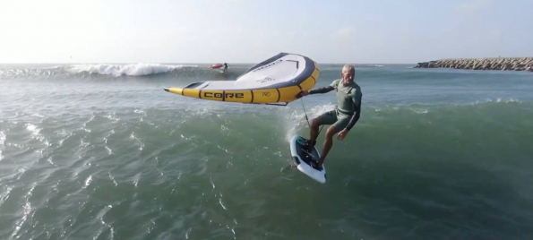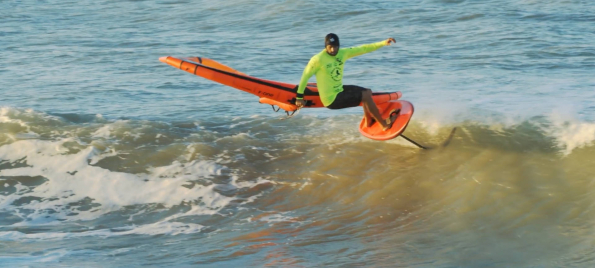 Stimmungsvolle Bilder - der nasse Strand spiegelt das Licht des Sonnenaufgangs, Wingen mit einem Landboard auf der Halbinsel Cotentin.