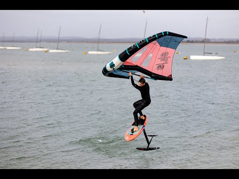 Wingfoilen in England, ein Slow Motion Clip auf Flachwasser mit dem UK Wingfoil National Champion 2022 Hugo Dobrijevic, unterwegs mit 5,5er Wing und 800er Frontflügel.