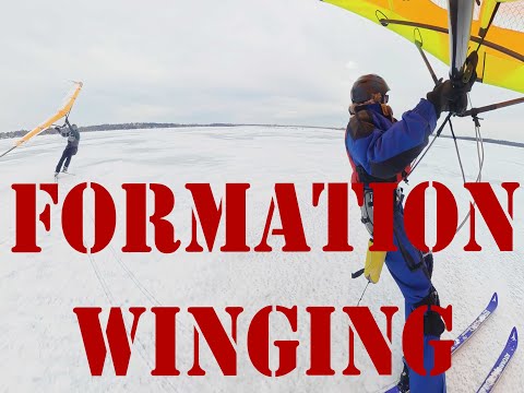 Im Formationsflug über den Simcoe Lake in Kanada. Eiswingen mit starren Kitewings und Old School Skiern.