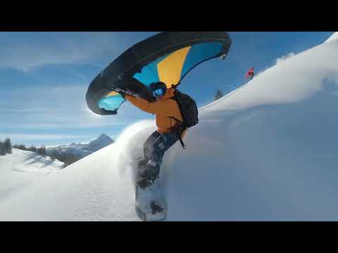 Seppl Ramsbacher auf den Lines im Absolut Snow Park bei Flachauwinkl und abseits der Pisten auf Tiefschneehängen. Snow Wingen mit Snowboard und Wing. Das Interview mit Seppl zu den Hintergründen findet ihr in dieser Snow Winging Story.