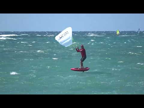 So fährt man mit dem Parawing. Alex Aguera zeigt, wie man den Parawing öffnet und wieder einfängt. Die 'Catch and Release' Technik kann man an Land üben. Alex ist den zweiten Tag mit dem BRM Parawing auf dem Wasser, das Foilen mit so einem fallschirmähnlichen Wing kann man also relativ schnell lernen. Zum Einpacken greift man in die Leinen (alle zusammen in einer Hand) und zieht den Wing mit der anderen heran. Zum Öffnen wird der Parawing einfach nach Lee geworfen, während die anderen Hand die Bar hält.