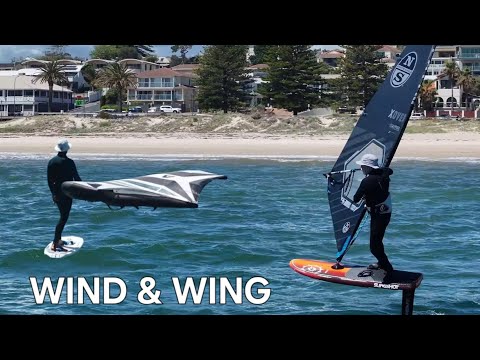 Foilen - mit Wing oder Windsurfrigg. Dion und Rob am Brighton Beach in Adelaide. Schlapphüte machen unter der intensiven Sonne Südaustraliens durchaus Sinn.