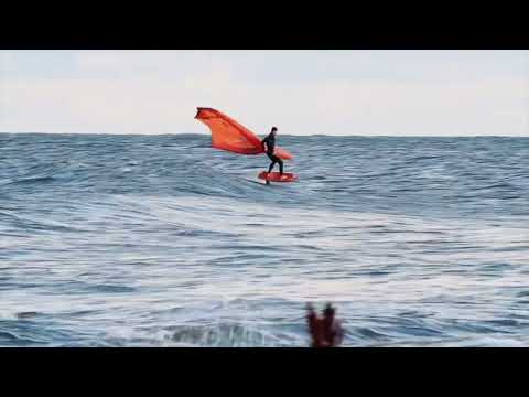 Wingen in den Wellen vor Gotland. Jacob und Arild von der Surfskolan Crew sind mit einem riesigen 7-Quadratmeter-Wing unterwegs, um aus der Windabdeckung der Bucht schneller wieder zum Line-up zu gelangen.