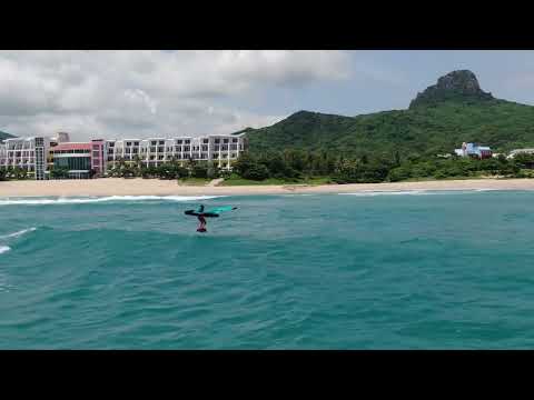 Strapless mit Schlapphut, eine Wingfoil Session in den Wellen vor Taiwan. Die Perspektive ist interessant, denn die Drohe wurde für die Aufnahmen ziemlich tief geflogen.