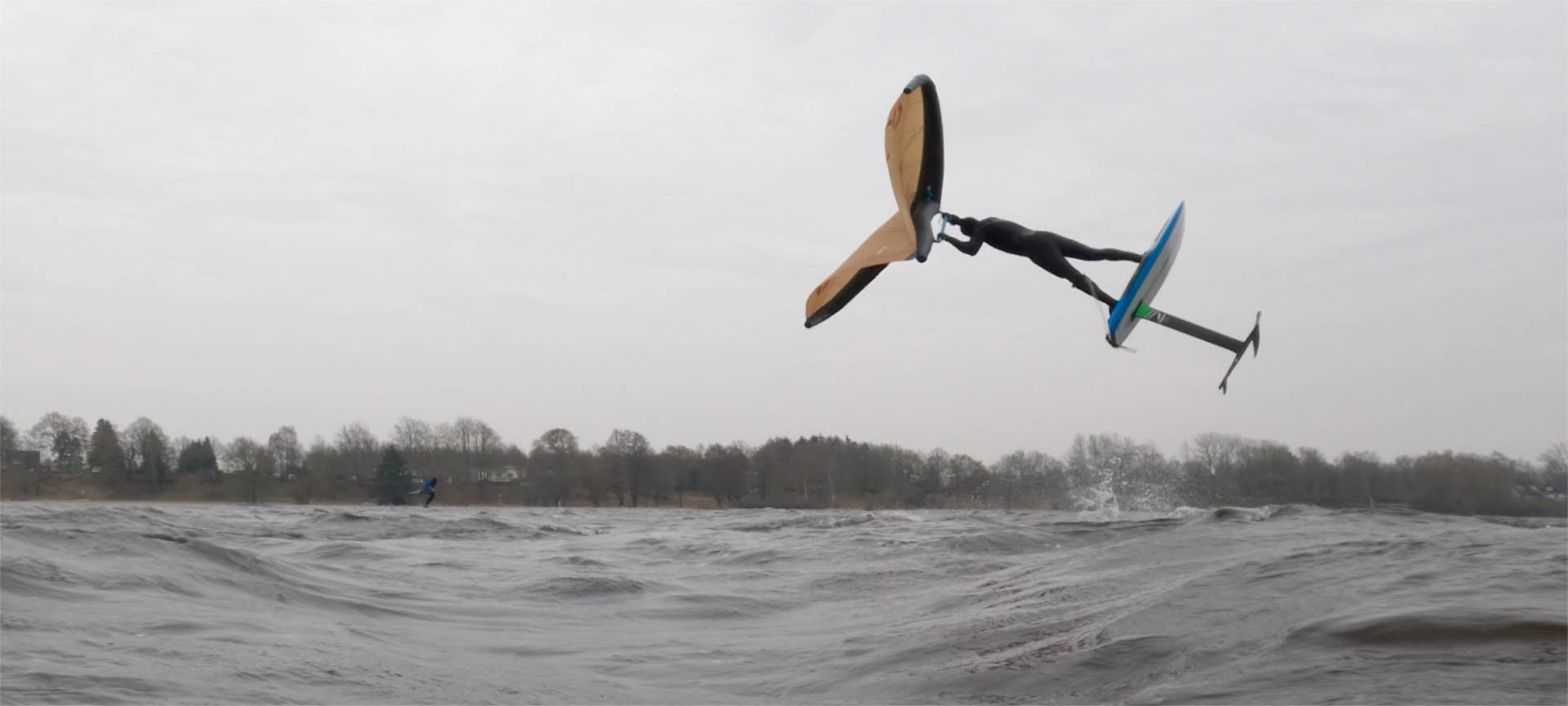 Das Board springt in einem Bogen in den Wind, der Wing wird aber mit der hinteren Hand dichtgezogen, damit dieser weiterhin auf Halbwindkurs fliegt. Das bringt die Dynamik in diesen Sprung: mit den Füßen in den Schlaufen und den Händen am Boom wird der Körper von der Fliehkraft in der Luft waagerecht ausgerichtet.